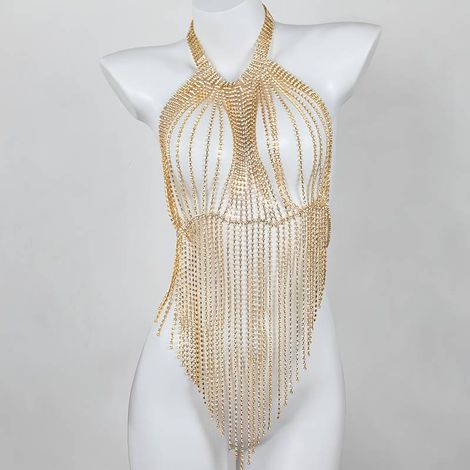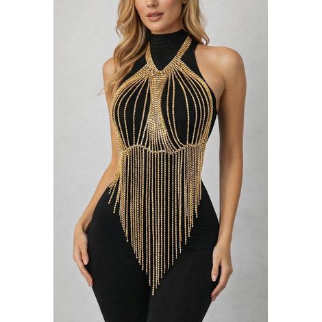 Bodychain confeccionado com correntes de strass lapidados, dispostos estrategicamente para realçar as curvas naturais do corpo.