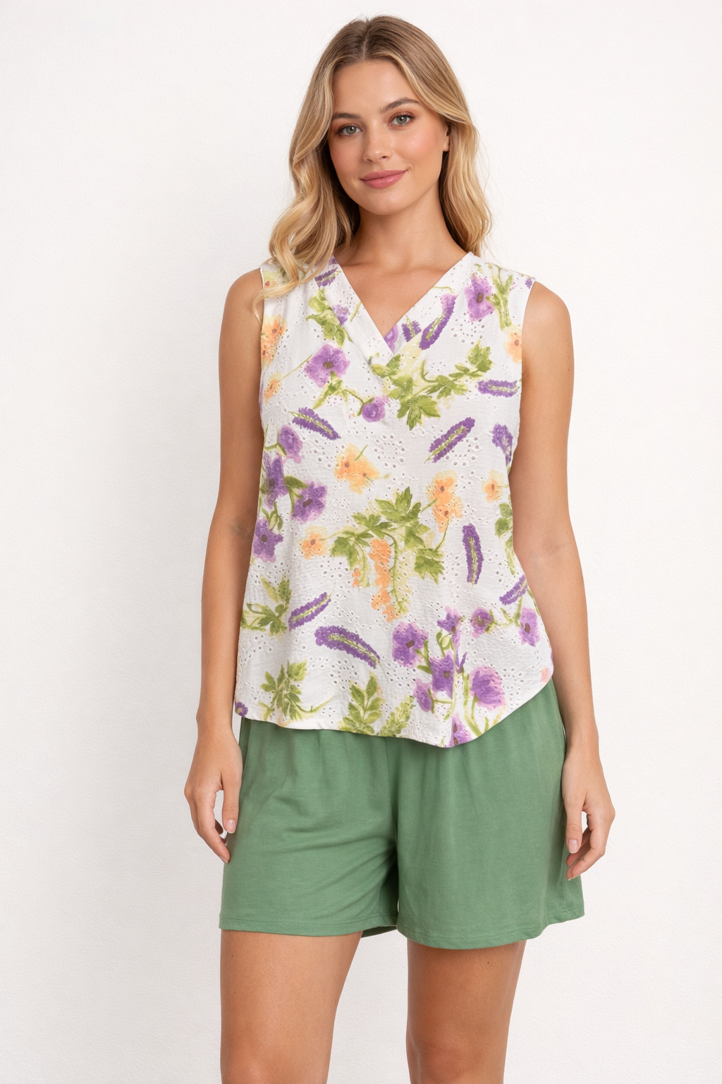 A blusa sem mangas possui decote transpassado em V, que valoriza o colo de forma elegante e discreta. Confeccionada em tecido leve e respirável, traz estampa floral em tons de lilás, verde e pêssego, transmitindo frescor e aconchego.
